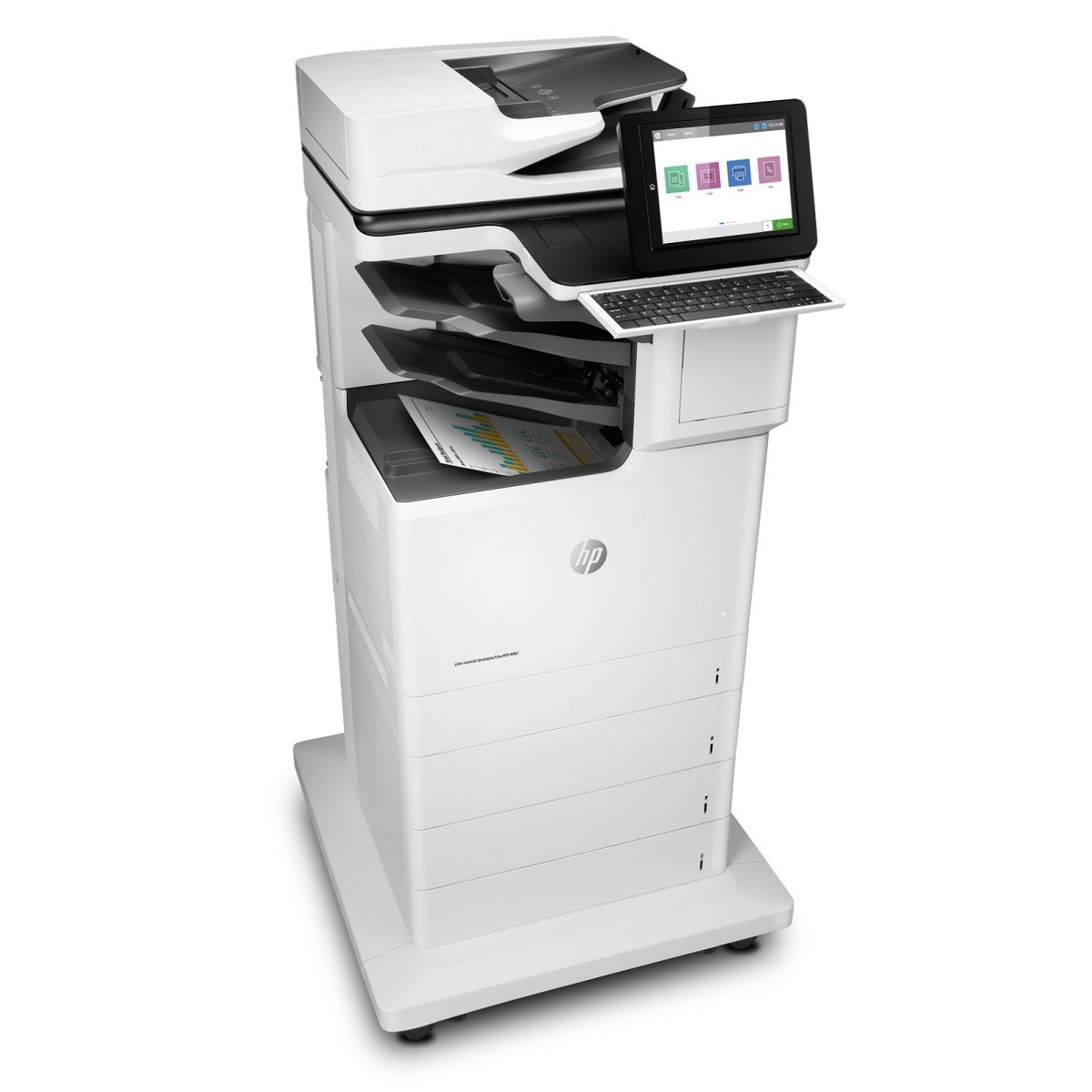 HP Color LaserJet Enterprise Flow M681z - цветное многофункциональное напольное устройство с лазерной технологией печати, в котором присутствует сканер, копир, принтер и факс. Емкость лотков у данной модели позволит надолго забыть об их частом заполнении. Для удобства управления МФУ имеется выдвижная клавиатура и большой цветной сенсорный дисплей с возможностью регулировки по углу наклона. Разрешение как для цветной, так и для черно-белой печати составляет 1200 dpi, что на выходе позволяет получать отличное качество. Максимальная скорость печати принтера приближается к 47 страницам в минуту, а время выхода первого листа всего 6,5 секунды.