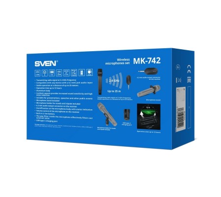 Беспроводные микрофоны обеспечивают отличное качество звука и свободу движений на любом мероприятии: от домашней вечеринки с караоке до большой презентации или выступления на сцене. При этом профессиональные решения стоят крайне дорого, а потому не всегда доступны широкому кругу потребителей. К счастью, наша компания регулярно расширяет ассортимент беспроводных микрофонов, которые могут позволить себе многие: их можно увидеть как на больших праздниках, так и на маленьких вечеринках с исполнением любимых песен. Недавно линейка пополнилась еще парой интересных устройств, в которых разработчики учли весь накопленный опыт и пожелания пользователей. Модель SVEN MK-742 — это сразу два микрофона с общим ресивером, которые пригодятся любителям петь или говорить дуэтом. Передача звука осуществляется через радиоканал на частоте 2,4 ГГц, что обеспечивает качественную связь на расстоянии до 25 метров. Для подключения предусмотрен широко распространенный разъем джек 6,3 мм, что позволяет использовать ресиверы микрофонов с любыми устройствами — от профессиональных микшеров до портативной акустики с поддержкой караоке, широко представленной в каталоге SVEN. Благодаря встроенным аккумуляторам микрофоны способны проработать в автономном режиме до 12 часов — этого точно хватит даже на большое мероприятие или продолжительную вечеринку. Зарядка осуществляется через современный порт USB Type C — пользователю не придется лишний раз искать нужный кабель и зарядное устройство, подойдут предназначенные для смартфонов и других гаджетов. Благодаря корпусу из алюминия микрофоны обладают повышенным запасом прочности и износостойкости, при этом в комплекте есть специальная подставка-упор, которая гарантирует устойчивое размещение на ровной поверхности — микрофоны никуда не укатятся, даже если просто положить их на стол, например. Ну и, конечно, предусмотрено крепление на стойку — соответствующий держатель пользователь также найдет в коробке со SVEN MK-742. Капсюль микрофона имеет кардиоидную направленность — как у профессиональных вокальных решений. Это помогает устройству воспринимать исключительно голос говорящего, игнорируя посторонние звуки и шумы. Дополнительную защиту обеспечивает встроенный поп-фильтр, который в частности может избавить звук от звуков ветра или дыхания пользователя. Хорошо потрудились разработчики и над комфортом эксплуатации микрофонов. Благодаря наличию регуляторов громкости на ресивере их можно подключать непосредственно к акустике, а оснащенная индикатором состояния клавиша на корпусе микрофонов позволяет быстро и легко включать и отключать звук в нужный момент. SVEN MK-742 — высококачественные, но при этом доступные микрофоны с продуманной конструкцией и отличным набором характеристик, которые подойдут широкому кругу пользователей: профессиональным вокалистам и любителям, ведущим мероприятий и лекторам.